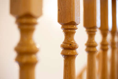 Element of a wooden interior staircase. Wooden baluster close-up.