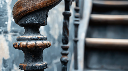 A stunning close-up of an antique staircase handrail showcasing its intricate metalwork and rustic wooden finish, ideal for architectural and design projects.