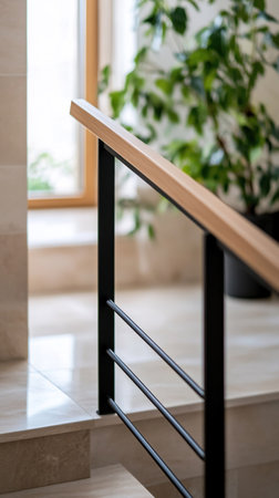 Close-up of a modern staircase railing featuring a wooden handrail and black metal supports. The design is minimalist and contemporary.