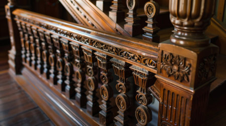 Wooden Railing of an luxury antique staircase, woodwork elements macro photograpy, retro design beautiful interior of a modern house