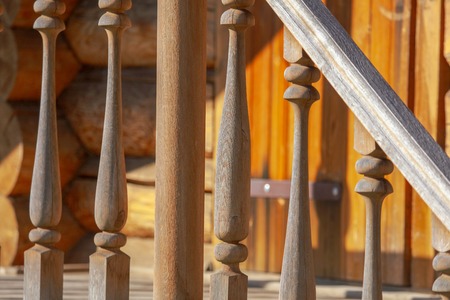 Balusters in the decoration of the veranda railings. An architectural element made of wood. An old manor outside the city. Detail of a building from the last century.