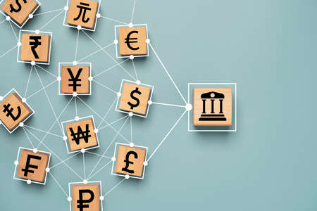 Central banking icon connect linkage with currency sign include US dollar Euro Yen Yuan and pound sterling for global money exchange and transfer or forex concept.