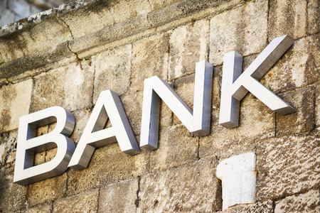 Old bank sign engraved in stone or concrete above the door of financial building concept for finance and business