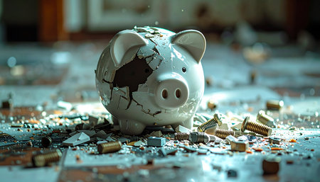 This image offers a powerful and gritty visualization of the financial struggles faced by many during times of economic hardship and uncertainty The shattered remains of a piggy bank once a symbol of