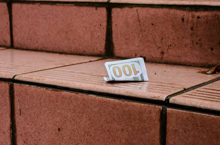 One hundred dollar bill lies on the red step outdoors. Folded Banknote on a wet street staircase. Close-up, selective focus.