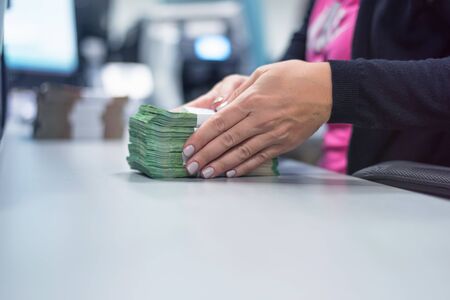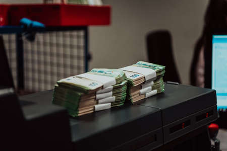 Sorted banknotes placed on the table after it is counted on the electronic money counting machine