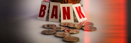 inscription bank in block letters and coins lie on a blurred background. Web banner.