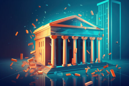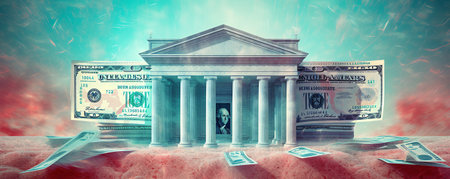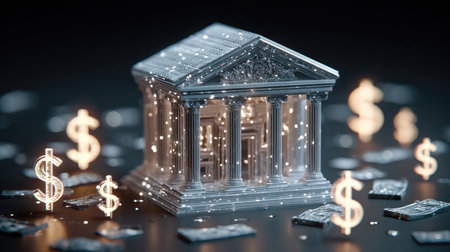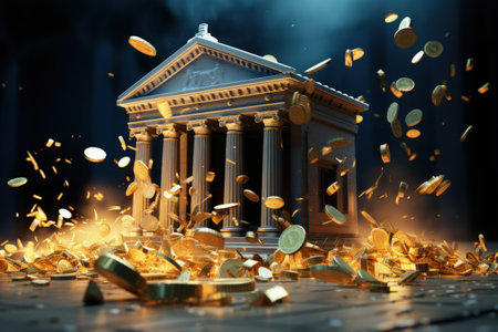 This dynamic image showcases a conceptual financial institution surrounded by currency symbols and banknotes, embodying modern finance and economic growth.