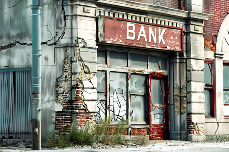 Abandoned, decaying bank building with broken windows and crumbling facade, symbolizing financial collapse. Generative AI