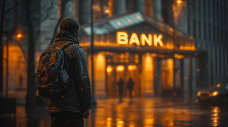 A solitary figure, clad in a dark coat, stands before a classic stone bank building. The neon BANK sign, glowing in the evening, creates a stark contrast against the moody surroundings