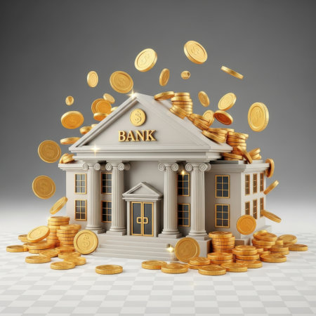 The image depicts a grand bank building with the word 'BANK' prominently displayed at the top. The building features classical architecture with columns and a triangular pediment. Golden coins are scattered around and above the building, creating an impression of wealth and prosperity. The coins are falling from above, adding a dynamic element to the scene.