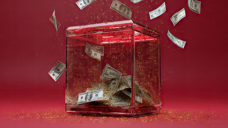 This image displays a glass box filled with US dollar bills, with additional currency notes appearing to fall into it. The scene has a red background and interior lighting, which accentuates the banknotes. The composition is suitable for illustrating financial, investment, or banking concepts. It could be used for advertising or editorial content related to wealth.