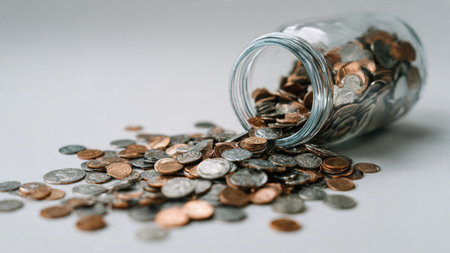 Modern savings presentation featuring a transparent jar angled slightly with coins pooled around it, commercial-safe.
