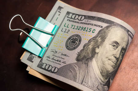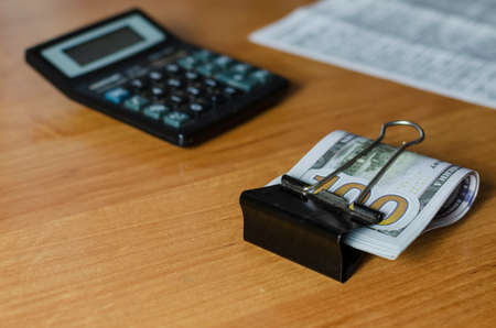 Money. American one-hundred-dollar bills clamped with a metal paper binder. A calculator and a piece of paper with text in the background. No people. Selective focus.