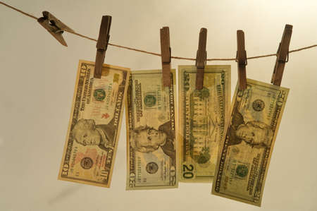 Washing money concept. 100 Dollar bills hanging on a washing line. Symbol of money laundering. Copy space soft focus.