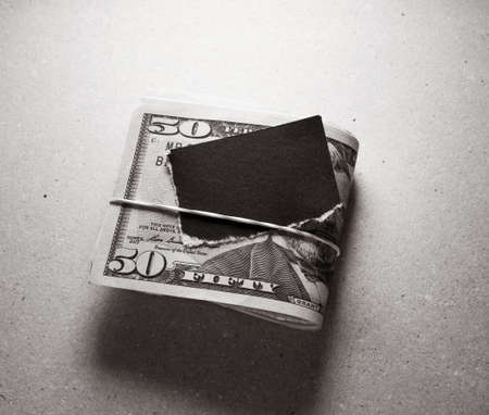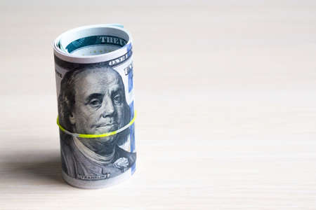 hundred dollar banknotes twisted and knitted by elastic on a light wooden. view from the side. close up copy space