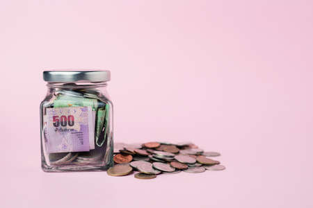 Thai currency banknote and coins in the glass jar on pink background for business, finance, investment and saving money concept