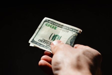 American cash dollars. Hundred-dollar bills in hand on blue background. Copy space for text.
