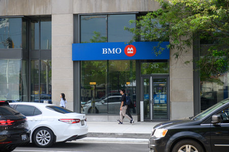 Toronto, ON, Canada – July 20, 2024: The logo and brand sign of the Bank of Montreal BMO branch in Canada.