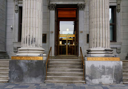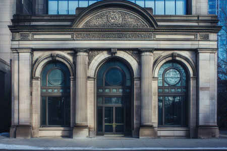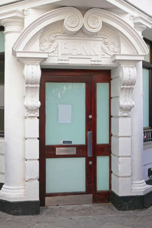 Architectural details highlight an entrance to a historic bank. The building features classic columns and intricate designs, showing its grandeur and historical significance.