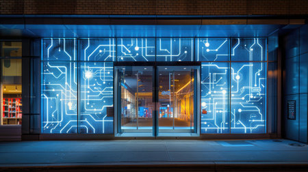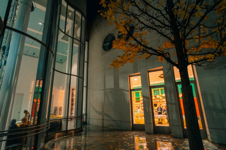 Contemporary bank architecture with glowing lights and reflective glass windows at dusk