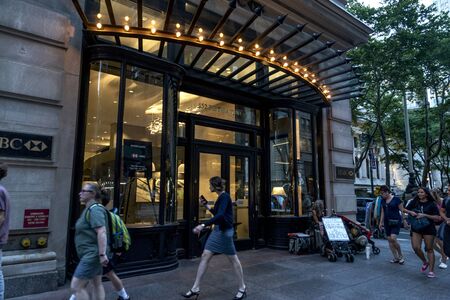 New York City, USA - August 1, 2018: Facade of a bank branch of HSBC Bank at night with a beggar and people around in 5th Avenue (Fifth Avenue), Manhattan, New York City, USA