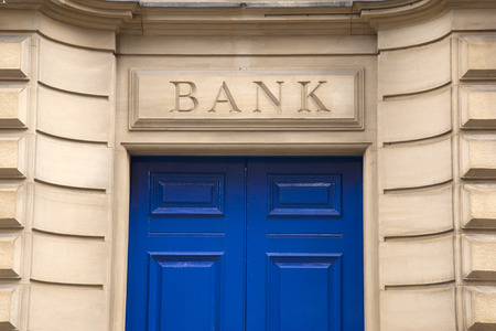 Old bank sign engraved in stone or concrete above the door of financial building concept for finance and business