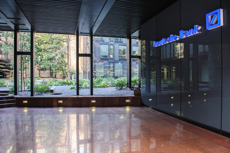 MILAN, ITALY - MARCH 20, 2015: On the streets of the city. Entrance to the building of Deutsche Bank..