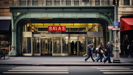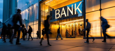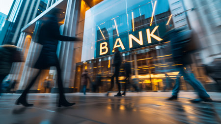 Blurred pedestrians walking past a modern bank building in a bustling city setting