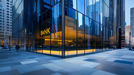 A low-angle view of a tall modern bank building towering in a city s financial district, reflecting the sky.