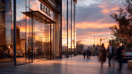A modern bank building reflecting a beautiful sunset with people walking by in the foreground