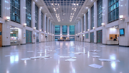 Empty financial hall with scattered papers on the floor, large windows, and bright interior lighting.
