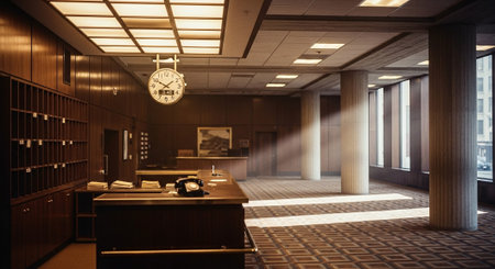 A retro office hallway featuring orange furniture, wooden paneling, and geometric wall art
