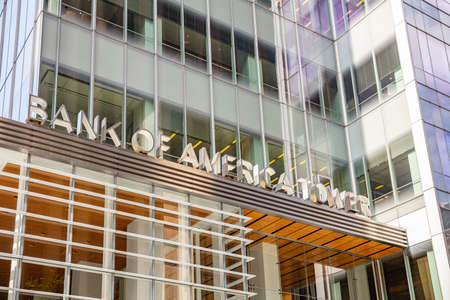 New York, USA. May 2nd, 2019. Bank of America Tower, glass building facade background, Manhatan