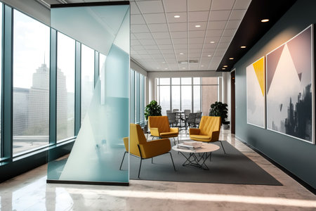 Modern office lobby with vibrant artwork and comfortable seating. Ideal for welcoming clients and creating a professional impression.