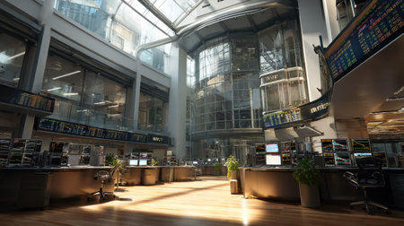 Brightly lit interior of a modern stock exchange with high ceilings and glass walls. Trading desks are equipped with multiple screens displaying financial data.