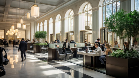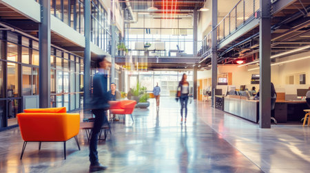 Long exposure shot of modern office lobby with business people. Generative AI technology
