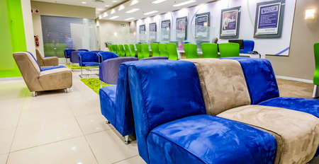 Empty waiting area in terminal International Airport. Modern lounge wait room with seats. No passengers, no vacation. Concept Air Transportation industry. Copy text space