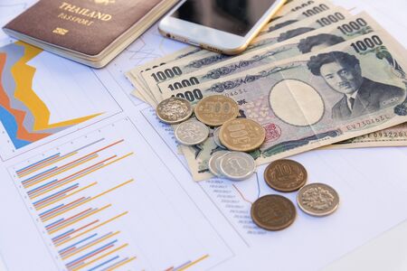 Japanese yen banknotes management for exchange and trading. Manage salaries, income, and expenses to be balanced. Financial, investment, and saving money after retirement concepts.