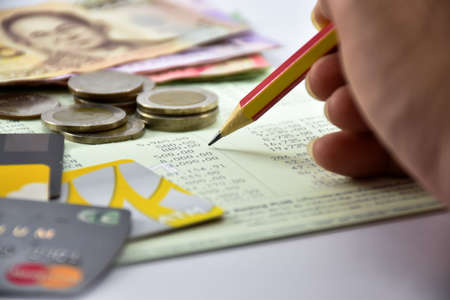 payment bill with red pen and coins.