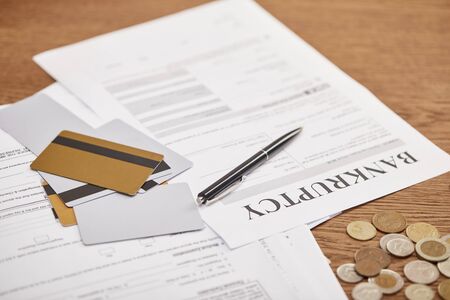 bankruptcy form among documents, credit cards and coins on wooden table