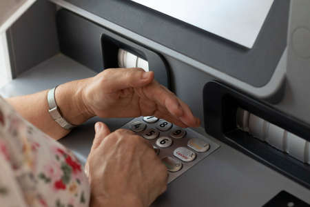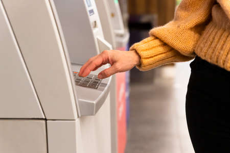 Close up of a womans hand entering secret code on the keypad of an ATM machine