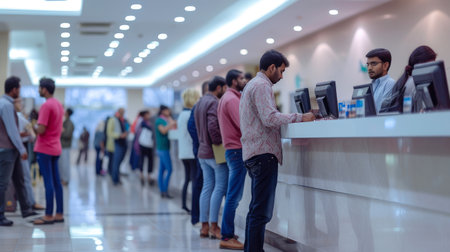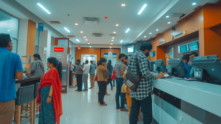 Interior view of a busy bank lobby with customers waiting in line, using services, and interacting with tellers during business hours.