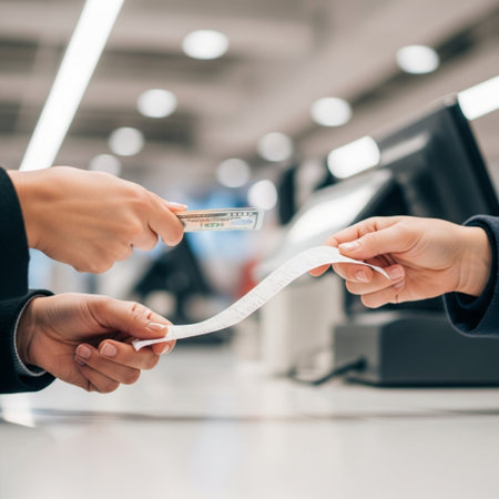 Customer withdrawing cash from a bank teller at the counter, engaging in a financial transaction while wearing a winter hat in the office interior