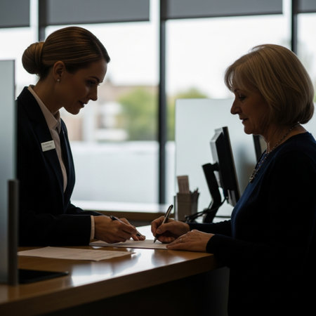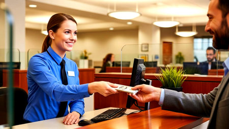 Editorial, cinematic image showing a professional bank teller providing focused assistance to a clie