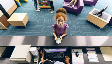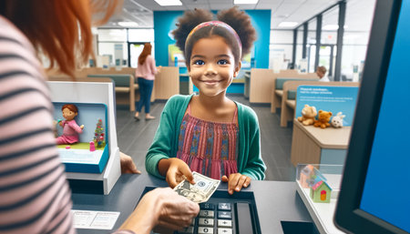 In a vibrant and welcoming children’s bank, a smiling young girl experiences the joy of saving as she hands over her hard-earned money, taking the first steps towards financial literacy.