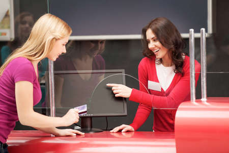 Consulting about the movies. Beautiful young women consulting cinema visitor about the movies and pointing monitor