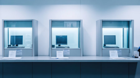 A sleek and modern office reception area featuring three workstations with computers, illuminated by soft blue lighting for a professional ambiance.