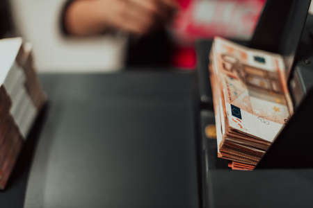 Bank employees using money counting machine while sorting and counting paper banknotes inside bank vault. Large amounts of money in the bank