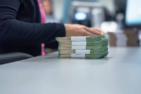 Bank employees holding a pile of paper banknotes while sorting and counting inside bank vault. Large amounts of money in the bank